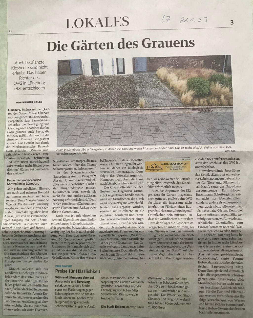 Die Stadt möchte die städtischen Grünflächen vermehrt mit Regenwasser wässern, das von der AGL aus dem Rückhaltebecken Blümchensaal entnommen werden soll. Damit ist geplant, den Wasserverbrauch um bis zu 80 Prozent zu reduzieren.Das ist sicherlich ein guter erster Schritt, dennoch finden wir, dass es ratsam wäre, die Regenrückhaltung mit Zisternen auszuweiten.Die Landeszeitung berichtete darüber am 17.06.2023