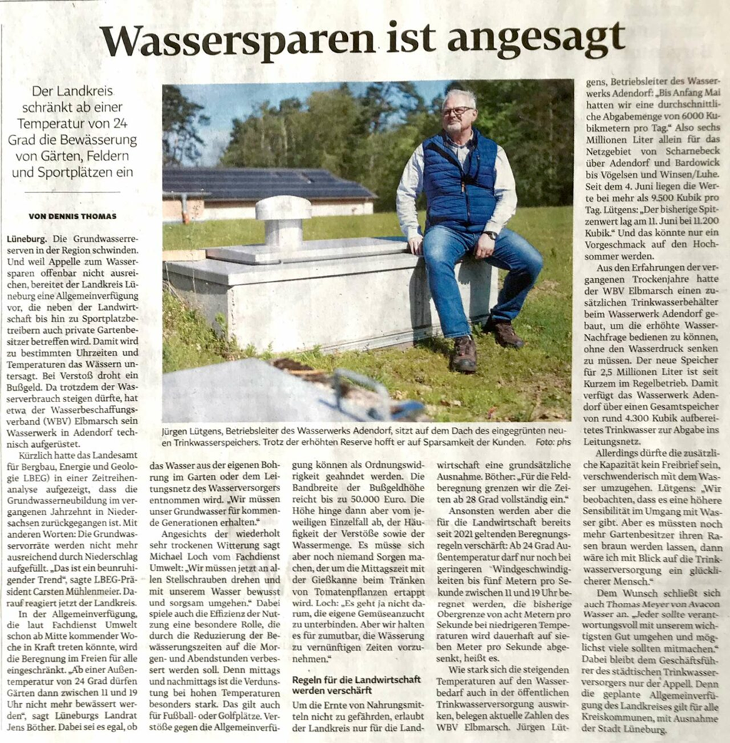 Der Landkreis Lüneburg veranlasst angesichts der anhaltenden Trockenheit eine Allgemeinverfügung zum Wassersparen. Die Stadt Lüneburg möchte dies jedoch erst machen, wenn sich die politischen Akteure damit auseinandergesetzt haben und appelliert an die Bürger*innen.Die Landeszeitung berichtete dazu am 16. und 17. Juni 2023