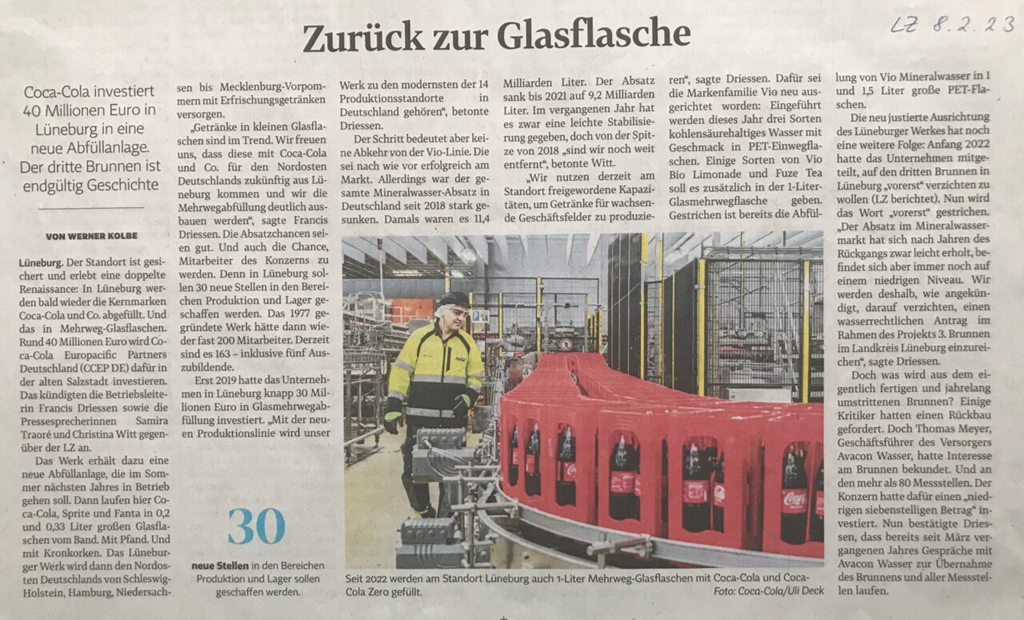 Der dritte Brunnen ist nun endgültig ad acta gelegt: Vielen Dank an alle, die dazu beigetragen haben! Darauf stoßen wir an – aber natürlich mit einem guten Glas Lüneburger Leitungswasser!Coca Cola wächst scheinbar auch ohne den dritten Brunnen und investiert in sein Lüneburger Werk und hat etwas Tolles dabei wieder entdeckt: Die Glasflasche.Wir bleiben dabei: Wasserhahn statt Flaschenwahn! Aber wenn es aus der Flasche mal sein muss, dann natürlich besser aus der Glasflasche.Der Artikel aus der ©Landeszeitung dazu ist vom 08.02.2023 und hier für Abonnent*innen zu lesen.Update, Mai 2023: Dritter Brunnen wird zurückgebaut, keine Einigung zwischen Wasserversorger, Coca Cola und GrundstückseigentümerDie Forderungen von Coca Cola und dem Grundstücksbesitzer, wo die Probebohrung für den dritten Brunnen erfolgt sind, sind dem Wasserversorger zu hoch: Der Brunnen wird nun endgültig zurück gebaut und steht nicht der allgemeinen Wasserversorgung zur Verfügung.Der Artikel aus der ©Landeszeitung dazu ist vom 25.05.2023 und hier für Abonnent*innen zu lesen.